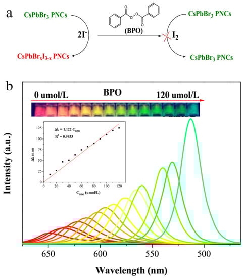 Before the applications using the wavelength-shift-based sensing of the CsPbBr3 PNCs for the determination of BPO, the validation method included linear range, the limit of detection (LOD), the limit of quantitation (LOQ), precision, and accuracy under optimized conditions. BPO has high oxidization characteristics and a good solubility in organic solvents. As shown in Figure 7a, BPO oxidizes OLAM-I, which reduced the halogen exchange between iodine and CsPbBr3 PNCs, resulting in the decrease of wavelength redshift in the reaction. The following experimental phenomena would verify the reaction process as 1 mL of 240 μmol L−1 OLAM-I reacted with different concentrations of BPO (0~120 μmol L−1 in toluene). After the reaction was complete, CsPbBr3 PNCs in an n-hexane solution was then added to observe the halogen exchange. The results showed that BPO reacted completely with OLAM-I within 5 min and directly reduced the halogen exchange of CsPbBr3 PNCs. In the absence of BPO, as shown in Figure 7b, the apparent color of CsPbBr3 PNCs changed from the original green to the red of CsPbBrxI3−x. With the increase of BPO concentration, although the wavelength redshift of the fluorescence emission could be observed in the reaction of OLAM-I and CsPbBr3 PNCs, the apparent color changed from red to orange, yellowish-green, and finally green, indicating the concentration decrease of OLAM-I due to the addition of BPO.