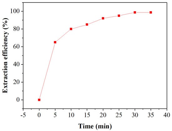 In the determination of BPO in flour and noodle samples, pretreatment is the key step. The BPO sample extraction procedures and timing were selected and optimized. Ultrasonic extraction was selected since the ultrasonic process is simple, highly efficient, and can effectively remove the dissolved oxygen in the solvent thus reducing the interference caused by the reaction of dissolved oxygen and OLAM-I. In the separation process, a direct filtration treatment method was applied in the National Standard Method (GB/T 18415-2001 Determination of Benzoyl Peroxide in Wheat Flour). However, flour particles easily block the pores of filter paper, which leads to problems such as irregular filtration, loss of extract, and incomplete extraction. In addition, the volatilization of organic extract in the filtration process can cause deviation of the test results and environmental pollution. In the experiment, the centrifugal precipitation separation method was adopted to achieve higher separation efficiency, more thorough extraction, and a smaller impact on the determination results. At the same time, using the centrifugal separation method significantly reduces the harm to the experimenter and the environmental pollution. The ultrasonic time was optimized as such: 1 g of flour or noodle powder was collected (BPO was added to the flour to make the mass concentration of BPO 24.2 mg kg−1), and 5 mL of n-hexane was used for the extraction. Generally, with the increase of extraction time, the extraction yield of BPO increased continuously, and so the concentration of BPO would be 120 μmol·L−1 if the extraction efficiency was 100%. Based on the redshift of the fluorescence emission wavelength, the experimental results as shown in Figure 8, indicate that 99.7% BPO in the sample could be extracted after 30 min. Thus, the optimal extraction time of 30 min was selected.