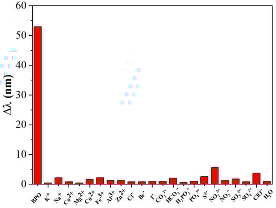 In the presence of 120 μmol L−1 BPO, OLAM-I was completely oxidized, and no halogen exchange could be found for CsPbBr3 PNCs. The experimental results as shown in the inset of Figure 8b reveal that 0~120 μmol L−1 BPO could be detected with this method. When the concentration of BPO exceeded 120 μmol L−1, the BPO would further oxidize CsPbBr3 PNCs, resulting in poor stability and interference in the determination due to the strong oxidation characteristics of BPO. The wavelength shift difference, Δλ, presented a good linear relationship with the concentration of BPO (CBPO) in the range of 0~120 μmol L−1; the linear equation for Δλ = 1.122 CBPO (R2 = 0.9933). Based on the limit of detection (LOD) = 3σ/K (where σ is the relative standard deviation of 12 blank measurements and k is the slope of the linear equation), the LOD and LOQ of 0.13 μmol L−1 and 0.43 μmol L−1 BPO could be obtained, respectively. The experimental results revealed that the alteration of the intraday coefficient for five duplicate samples of 10 μmol L−1 BPO was less than 4.2%. Meanwhile, the alteration of the interday coefficient was less than 5.6% for the same concentration of BPO during three days.