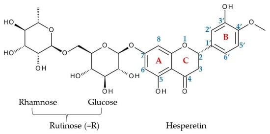 Hesperidin (HESP), 3′, 5, 7-trihydroxy-4′methoxyflavanone-7-rutinoside, (Figure 1) is a bioflavonoid (glycosidic flavanone) abundant (mainly in the peal and white part) in Citrus species (Rutaceae family) like the common orange, lemon, etc., but it can also be found in other different plants, including peppermint []. HESP and its aglycone hesperetin have a wide range of biological effects due to their immune-stimulant, anti-microbial, antioxidant [], anti-inflammatory, anti-infertility, UV-protecting, anti-allergic, anti-nociceptive, anticonvulsant [], and anti-aging properties []. HESP administration decreases the capillaries permeability and increases their resistance, thus being benefic in blood vessel disorders such as hemorrhoids, varicose veins [], oedema, hemorrhage, pleurisy, Henoch-Schönlein purpura, and tuberculosis []. On the other hand, it is largely employed as a treatment in a variety of cardio-vascular diseases []. Extrinsic and intrinsic apoptosis and the growth inhibitions of several malignant cells are mediated by HESP, this bioflavonoid being effective against various cancers, including leukemia and colon, gastric, liver, cervix, breast, and lung cancer [,]. Taking into consideration that HESP appears to have an inhibitory effect on obesity illnesses by regulating lipid and glucose metabolism, dietary supplements containing it also help to reduce symptoms such as postprandial hyperglycemia and hyperlipidemia [,]. Acting through different mechanisms, HESP has benefic effects in diabetic retinopathy []. Due to its antioxidant and biomembrane stabilization properties, HESP can exert protective effects in Parkinson’s disease models. It reduces the depressive symptoms by modulating the kappa-opioid and serotonergic 5-HT1A receptors []. HESP antidepressant effect was demonstrated on mice exposed to chronic unpredictable mild stress []. Based on its powerful memory-enhancing and antioxidant benefits, it has the potential to be used as a treatment for Alzheimer’s disease and dementia. HESP capacity to boost anti-oxidative defense might be one of the processes involved in cognitive function improvement []. Besides this, HESP anti-oxidant and anti-inflammatory effects are benefic in different central nervous system disorders emphasizing its nutraceutical use for their prevention and currying [].