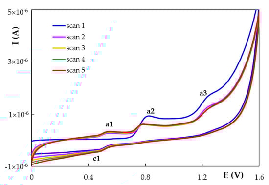 The first five successive cyclic voltammetric scans recorded at H type PGE for 1.00 × 10−4 mol/L HESP in BRB solution pH 1.81; scan rate 0.100 V/s.