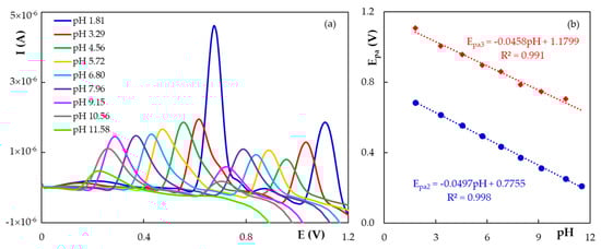 (a) Differential pulse voltammograms recorded at H type PGE for 5.00 × 10−5 mol/L HESP in BRB solutions with different pH values and (b) the corresponding Epa = f(pH) dependencies for the two HESP oxidation peaks.