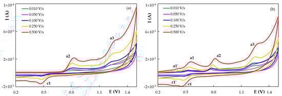 Cyclic voltammetry performed at different scan rates was employed for the investigation of HESP voltammetric behavior in BRB solution pH 1.81. Two potential cycles were recorded at H type PGE in the potential range 0.000 to 1.500 V, applying different scan rates (0.010 to 0.500 V/s). Figure 5a indicates that in the first forward cyclic voltammetric scan HESP presented a well-defined anodic signal at ~0.800 V (a2) and at scan rates higher than 0.050 V/s a second one appeared at ~1.230 V (a3). These two peaks were observed also in the next consecutive scans, but they were less intense (Figure 3) and were due to irreversible oxidation processes.