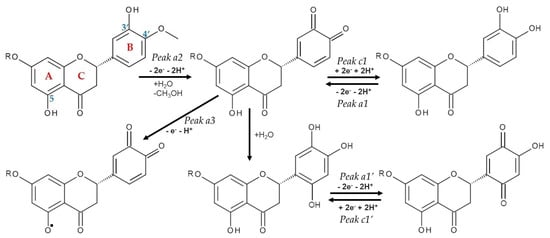 The antioxidant activity of bioflavonoids in general, and HESP in particular, is based on their ability to donate electrons/protons, thus scavenging the free radicals and terminating chain reactions. This chemical property of high biological significance is due to the oxidizable hydroxyl groups present in their molecular structures. It is well-known that there is a correlation between the antioxidant efficiency and how easy it is to be oxidized for a species, reflected in its electrochemical parameters, mainly the oxidation potentials (obtained most often by cyclic voltammetry), i.e., a lower oxidation potential indicates a higher scavenging capability and thus higher potential antioxidant effectiveness. Therefore, electroanalysis is one of the most important tools for the quick and simple assessment of a species’ antioxidant effectiveness and could help understanding some redox governed biological processes, giving insight in the reaction kinetics and number of involved electrons and protons. Various (bio)sensors are continuously developed for many analytes with biological and clinical significance and consequently electrochemical (bio)sensing became a low-cost and rapid prognostic and monitoring tool for different diseases, including also COVID-19 [,].