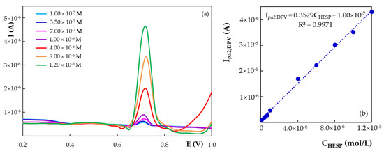 It is well-known that DPV is a more sensitive technique than CV. Therefore, the influence of HESP concentration (2.50 × 10−8 to 5.00 × 10−5 mol/L) on both its main oxidation (a2) (Figure 7) and reduction (c1) signals, respectively, was investigated by recording DP voltammograms at H type PGE in BRB solution pH 1.81 by scanning the potential in the anodic and cathodic direction, respectively. The intensity of the main anodic signal (Ipa2) varied linearly with the concentration over two orders of magnitude (Figure 7, Table 3). The cathodic DPV peak current (Ipc1) presented a linear dependence on the analyte concentration (Ipc1,DPV = 1.7632 × CHESP–4.00 × 10−8; R2 = 0.9985) only within a narrow range, namely 2.00 × 10−6–1.20 × 10−5 mol/L HESP (Table 3).