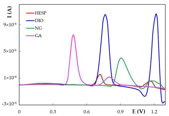 Overlaid differential pulse voltammograms recorded in the anodic direction at H type PGE for 5.00 × 10−6 mol/L HESP, 1.00 × 10−5 mol/L DIO, 5.00 × 10−5 mol/L NG, and 5.00 × 10−5 mol/L GA.