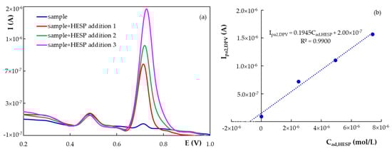 Differential pulse voltammograms recorded at H type PGE for 10 mL diluted dietary supplement capsules solution in BRB pH 1.81 before and after successive additions of 0.025 mL 4.00 × 10−4 mol/L HESP stock solution and the corresponding calibration graph (inset). (a) Differential pulse voltammograms recorded (b) the corresponding calibration graph.