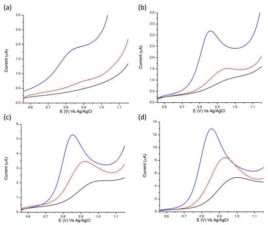 In our previous paper, we demonstrated the effectiveness of HMT-PMBI in preconcentrating negatively charged redox species such as IrCl62− [48]. In a similar fashion, using electrochemical characterization we calculated parameters such as the concentration of the redox mediator within the coating and the apparent diffusion coefficient of HMT-PMBI/NGNP coated films (see Supplementary Materials, S4–S9). The preliminary characterization demonstrated that HMT-PMBI and HMT-PMBI/NGNP coated electrodes are suitable to preconcentrate negatively charged redox mediators. For instance, the addition of NGNPs led to a threefold increase in the active surface area of the electrode with a concomitant increase in the apparent diffusion coefficient of more than one order of magnitude compared to HMT-PMBI. In order to ascertain the possibility of using the coated electrodes for the detection of nitrites in cured meat, we first tested the electrochemical behavior of the composite materials in standard solutions containing nitrite ions. Figure 1 shows the linear sweep voltammograms (LSVs) of bare GCE, HMT-PMBI, and HMT-PMBI/NGNP coated electrodes in a solution containing various concentrations of NO2− from 1 μM (a) to 100 μM (d).