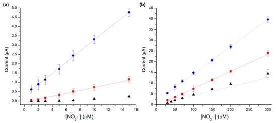 Plot of anodic peak currents vs. concentration of nitrites for bare GCE (black triangles), HMT-PMBI (red squares) and HMT-PMBI/NGNP coated electrodes (blue circles)—(a) from 1 µM to 15 µM; (b) from 30 µM to 300 µM. The supporting electrolyte was 0.1 M NaCl and scan rate was 0.1 V s−1. Error bars were calculated from three repeat measurements.