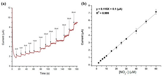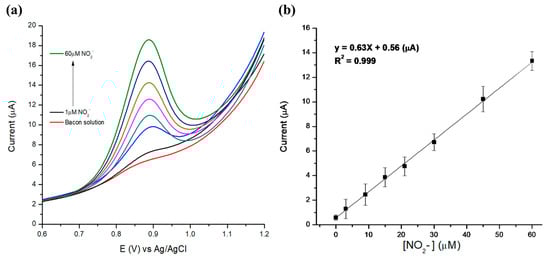 The electrochemical detection of nitrites in the bacon solution was also studied using chronoamperometric measurements. The solution was used without any pretreatments or dilutions, and nitrites were added to the solution during the chronoamperometric experiments. Figure 5a shows the amperometric i–t graph obtained after the addition of different concentrations of nitrites, whereas Figure 5b represents the calibration plot corresponding to the peak current vs. added nitrite concentration. The calculated linear regression was Ip (μA) = 0.115 (μA μM−1) (nitrites) (μM) + 0.1 (µA) with the uncertainty calculated as 0.115 ± 0.003 for the slope and 0.10 ± 0.04 for the intercept.