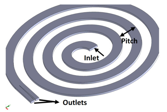 Time-dependent computational fluid dynamics (CFD) were used to model the flow into the microfluidic system. The full Navier–Stokes equations were solved with the commercially available software package, ANSYS Fluent (ANSYS, Canonsburg, PA, USA). For the modeling of suspended particle pollutions in the air, discrete phase modeling (DPM) of particles was used in a fully coupled condition to ensure that the interactions between the flow and particles were considered. DPM consists of spherical particles uniformly dispersed in the continuous phase [29]. For optimization of the spiral fluidics, multiple designs with various parameters have been modeled. The parameters that have been selected for optimization include the channel cross-section (channel width and channel height) and the spiral pitch, which defines the channel curvature. For the optimization process, the number of revolutions and the inlet/outlet flowrates were fixed. Even though the number of revolutions has an impact on the separation efficiency, it affects the total footprint of the chip, and therefore, it has been assumed to be constant based on the presumed chip dimensions. Figure 3 shows the schematic of the microfluidic system and the location of the inlet and outlet.