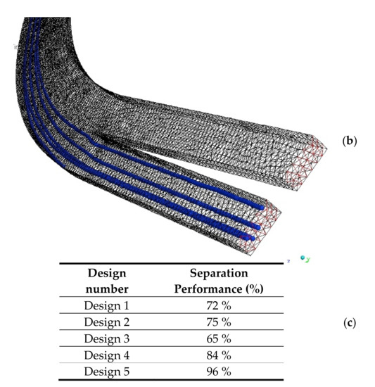 Various combinations of parameters created five different designs that are summarized in Table 1. The separation of particles in the fluidic system was simulated, and the performance of particle separation was compared. For finding the separation performance, the number of particles that are exiting from each outlet was counted. The ratio of the number of particles exiting from the lower outlet and all the particles injected from the inlet for the duration of 60 s is calculated as separation efficiency. As an example, when all the injected particles are escaping from the lower outlet, the performance is assumed to be 100%. Table 2 outlines typical atmospheric air properties that have been used in the simulation step [13,30].