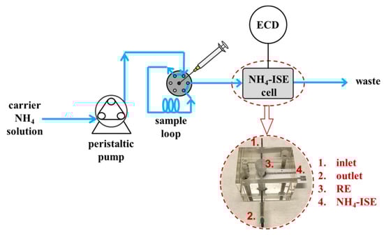 Schematic presentation of the FIA device used for ammonium sensing with the potentiometric flow cell. RE—reference electrode; ECD—electrochemical detector.