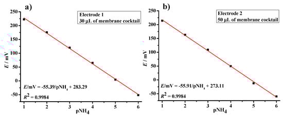 In the manufacturing process of all solid-state ISE, where the internal electrolyte solution is replaced by a rigid conductor, close contact between the selective membrane and the conductive material is crucial for ion-to-electron conduction to work correctly []. Graphite is an inexpensive and abundant material, with adequately low resistivity for the aforementioned purpose, and can be manufactured into a wide variety of forms, making it a popular choice as an electrode material []. The next step in the development of the ammonia sensing platform consisted of applying the ion-selective membrane mixture in volumes of 30 µL (electrode 1) and 50 µL (electrode 2) directly onto the surface of the graphite electrode []. Therefore, after drying at air conditions for 24 h, two different ammonium-selective membrane coated graphite electrodes were prepared and tested in the analyte solutions (Figure 2). The presented graphical plot clearly shows that both electrodes achieved an almost identical sub-Nernstian response of 55.39 mV/decade (electrode 1) and 55.91 mV/decade (electrode 2). Hence, the effect of membrane thickness is not significantly pronounced. However, since the electrode coated with 50 µL of the membrane mixture showed a slightly better response, it was selected for further investigation.