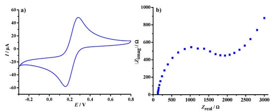 Cyclic voltammetry is a common and often the first electroanalytical technique of choice to obtain preliminary information about electrochemical reactions [,]. The reversible behaviour of the ferricyanide/ferrocyanide redox-couple was observed at the bare graphite electrode, with a pronounced anodic maximum at 302.7 mV, as well as a cathodic current trough at 143.4 mV (Figure 3a). The position of the peaks on the potential axis indicates a heterogeneous electrode surface consisting of edge and basal graphite planes [], while the existence of only one distinct current wave indicates a one-electron transfer process, described as: