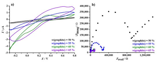 In order to improve the adhesion between the PVC layer and graphite electrode, as well as the analytical performance of the ammonium selective sensor, a layer of lipophilic material in combination with conductive material was introduced between the graphite electrode and the ammonium-selective membrane. In order to select the best formulation for the development of the potentiometric sensor, four different graphite-PVB formulations were prepared, layered over a graphite disk electrode, and tested as a transducer assembly. The bare graphite and graphite-PVB modified electrodes were electrochemically characterised using the CV and EIS techniques in a 5 mM [K3Fe(CN)6] with 0.1 M KCl as background electrolyte. Both CV and EIS measurements were performed in a three-electrode electrochemical cell (previously described in Section 2.4); results were plotted vs. reference electrode. The simple Randles cell with Warburg element was used to simulate the impedance spectra [].
