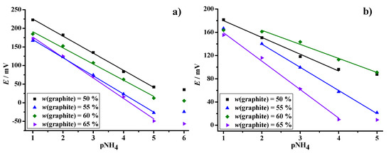 Dynamic response diagrams of the graphite disk electrode modified with a transducer layer of different wt % graphite particles embedded in PVB and coated with a layer of ammonium-selective membrane. Measurements were performed in NH4Cl solution, c(NH4) = 10−1 M–10−6 M, after storage of the sensor under dry (a) and wet (b) conditions. Lines represent the linear fit of the data points, over the determined linear range.
