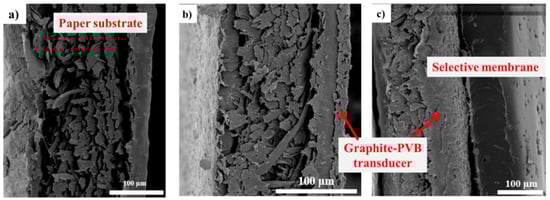 Paper is the most commonly used flexible substrate worldwide. From the perspective of inkjet technology, the high surface roughness of paper, together with its porous structure, can lead to absorption of the printed functional material. Moreover, the bonding between the functional material and the substrate is deficient due to its poor chemical and mechanical properties. For this reason, paper substrates are usually covered with a plastic film []. Therefore, for the development of a planar ammonium-selective potentiometric sensor, a paper substrate precoated with a polymer layer that allows sintering at room temperature is used. To gain insight into the sensor structure, SEM micrographs of the cross-section of the planar electrode were given in Figure 6. A paper structure with inkjet-printed silver line is shown in Figure 6a. The graphite-PVB layer is evenly distributed on the silver electrode fabricated by inkjet-printing and covers the entire inner contact area (Figure 6b). It can be seen that its structure is dense and uniform, which could allow a better bonding between the solid contact and the silver substrate. The ammonium-selective membrane forms a smooth, gel-like film over the deposited graphite-PBV transducer layer with randomly distributed pores in structure (Figure 6c). This homogeneous structure is the result of the addition of a plasticiser, which leads to the reduction of the brittleness of PVC [].