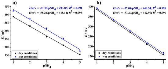 To investigate the analytical features of the potentiometric sensor, both electrodes (i.e., drop-casted and dip-coated) were tested in a dry and wet surrounding (Figure 7). To study the effects of wet conditions, the paper electrodes were immersed in a 10−3 M KCl solution for 24 h. The conditioning step is a crucial step to improve the sensor performance, since the membrane primarily does not contain ammonium ions. Thus, the lack of thermodynamic equilibrium in the electrode/solution interface can lead to a potential fluctuation when the prepared ammonium selective electrode comes into contact with the sample solution [].