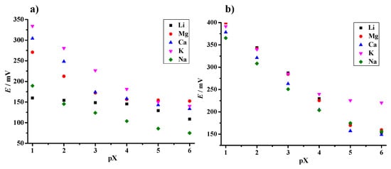 In SSM the electrode potential is measured in a solution containing only one type of potential-generating ions—either the primary or the disturbing ones []. This method is simple to perform but is considered unreliable because it does not reflect the real analytical situation when primary and interfering ions are present in the solution and are in thermodynamic equilibrium with the ion-selective membrane. In FIM, measurements are performed in solutions of primary ions with increasing concentration and interfering ions with constant activity. The selectivity is determined by the intercept of the extrapolated linear response of E versus the logarithm of the activity of the primary ion. This method more accurately reflects experimental conditions and is recommended by IUPAC []. The potentiometric selectivity responses of the prepared planar sensor, measured with separate and mixed solutions, are shown in Figure 9. In addition, the selectivity coefficients calculated using SSM and FIM are provided in Table 2.
