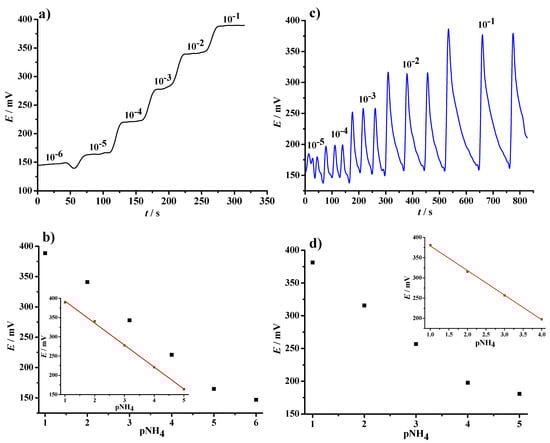 Time-dependence response of NH4 selective paper sensor in a continuous flow (a) and injection flow conditions (c), obtained with a 0.833 mL/min flow rate of the carrier stream (10−6 M NH4Cl solution prepared in 10 mM CaCl2). Corresponding dynamic and linear response plots (b,d) were also given.