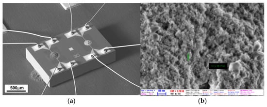 Thermocatalytic sensor element: (a) SEM image of silicon MEMS chip size is 2 × 1.2 mm2: The two identical membrane type microhotplates are covered manually with active (dark color) and reference (light color) gas sensitive substances; (b) SEM image of active catalytic Al2O3 layer deposited on the microhotplate.