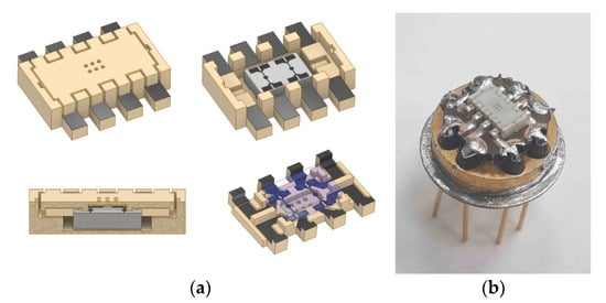 SMDsensor package: (a) 3D model of the sensor package: dark color—Ag metallization, olive color—Al2O3 ceramic, grey color—MEMS silicon chip; (b) Self-developed sensor package in SOT-89 form-factor size soldered on PCB mounted in the metal-glass TO-8 package (diameter of top part is ~11 mm []).