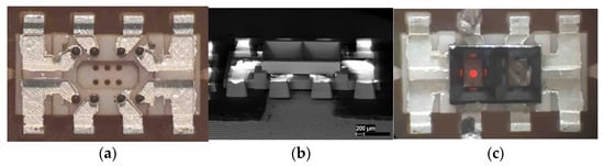 Standard flip-chip technology was proposed for mounting the MEMS silicon chip in order to meet the above requirements. The flip-chip technology was modified by considering that the MEMS silicon chip with the micro-heater cannot be mounted upside-down, since the active catalyst needs an air gap on its top to let the ambient diffuse through the holes in the package cap and access the sensing surface. The solution was found in printing the Ag metallization to the inner part of the package cap and gluing the MEMS silicon chip to this metallization using micro dots of Ag paste (image is seen in Figure 3a) directly to platinum contact pads. To position the non-transparent MEMS silicon chip in the package cap correctly, angular guides were micro milled by the laser with an accuracy of 10 μm. This facilitates the accurate positioning of the contact pads on the MEMS silicon chip against the micro Ag glue points (see image in Figure 3b). In order to avoid the short circuiting on the MEMS silicon chip, the Ag dots were deposited in the form of 30 μm columns. After gluing the MEMS silicon chip, an electrical test was carried out (shown in Figure 3c) and the package cap was glued with Ag paste to the basement part of the package. To fix the MEMS silicon chip, drops of the same silver paste, TOK-2 [], were deposited in the bottom of the package at the corners in order to bond and support the chips on the bottom side as well to eliminate the risk of “hanging the chip from above” in package by the platinum contact pads (which should give weak vibration resistance).