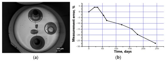 Since the chemical power of the developed catalyst in this volume is not suitable for long-term use of a MEMS sensor, the next long-term tests were performed on a standard bead type sensor with similar parameters of the work []. The sensor, in this case, is a hollow cylinder, whose frame is a heating coil made of platinum microwire (diameter of 10 μm) in quartz-shaped insulation (2 μm thick) covered by the developed catalyst (for deposition, the viscosity of the ink containing catalyst increased). The inner and outer diameters of the coil are ~200 µm and ~350 µm, respectively (Figure 5a). The power consumption is 150 mW for the two beads (active and reference) in continuous 450 °C measurement mode. The sensitivity loss of the catalyst is presented in Figure 5b.