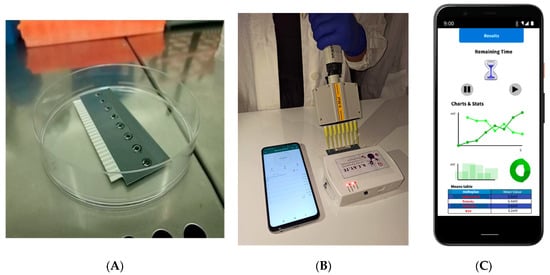 Biosensor’s set-up. Carbon screen-printed multi-electrode (8×) cassettes were prepared with 3D membrane-engineered cell cultures (A). The electrode strip was attached to a portable custom-made potentiometer connected to a smartphone device via Bluetooth for measurements’ recording immediately after the sample addition (B). The bio-electric signal produced was presented as a voltage vs. time graph on the screen of a smartphone (C).