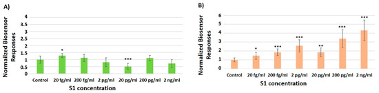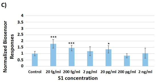 A 10 μL sample volume of several concentrations of the S1 protein (20 fg/mL, 200 fg/mL, 2 pg/mL, 20 pg/mL, 200 pg/mL and 2 ng/mL) was applied to a population of 50 × 103 membrane-engineered cells in suspension. Upon exposure to increasing concentrations of SARS-CoV-2 spike S1 protein, the SK-N-SH/ACE2 membrane-engineered cells demonstrated differential responses depending on the ACE-2 concentration used. The lowest ACE2 concentration (Figure 2A) presented statistically significant differences after application of 20 fg/mL and 20 pg/mL S1 protein when compared to the control (plain PBS solution). Overall, the bioelectric signal produced was relatively weak in comparison with the cellular responses obtained with the 1500 Units/mL (Figure 2B) and 2250 Units/mL (Figure 2C) of ACE2. A semi-linear concentration dependent pattern was observed with the use of 1500 Units/mL of ACE2 for cell membrane engineering. The limit of S1 detection was very low, down to 20 fg/mL, and very strong signals were obtained even at the highest concentrations used (2 ng/mL). In contrast, when 2250 Units/mL of ACE2 were used for increasing cell specification the results obtained displayed a decrease in the cell membrane potential. This effect, i.e., the decline of the biosensor response above low target analyte concentrations when the biorecognition element has been electroinserted at low or high concentrations (750/2250 Units/mL) is a frequent, yet not fully investigated phenomenon in molecular recognition through membrane engineering [37,38]. It is possibly due to either low level of responses at low ACE2 concentrations (even at higher S1 concentrations) or due to regional ion fluctuations of the cell membranes during the interaction with the analyte [39].