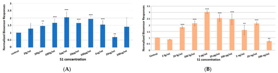 Normalized (ratio to control) cell biosensor’s responses in 3D cultures against the SARS-CoV-2 spike S1 protein in PBS (A) and spiked nasopharyngeal solutions (B). SK-N-SH/ACE2 cells membrane-engineered with 1500 Units/mL of ACE2 were used as the biorecognition elements. ***: statistically significant different results (p < 0.001); **: statistically significant different results (p < 0.01). Results (mean ± SD) are presented after 3 min (columns) of sample–cell interaction and are expressed as ratio to control (n = 16).