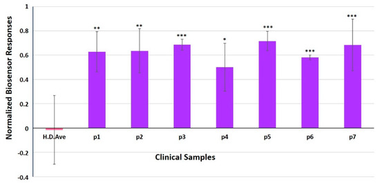 Normalized cell biosensor’s responses in 3D cultures against clinical samples from patients (n = 7) and healthy donors (mean of 10 samples—pink column. Results are expressed as normalized biosensor responses ([control–sample response]/control). Significant differences (Student’s T-test) between normalized biosensor responses * < 0.05, ** < 0.01, *** < 0.001.