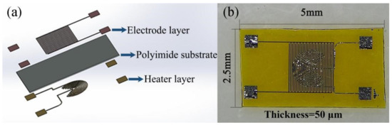 The structural design of the flexible gas sensor is shown in Figure 2. The sensor chip included a Pt heating layer, a flexible PI insulating substrate, and a sensitive layer comprising a Pt interdigital electrode, to form a sandwiched structure. The dimensions of the sensor chip were 5 mm × 2.5 mm × 50 μm.