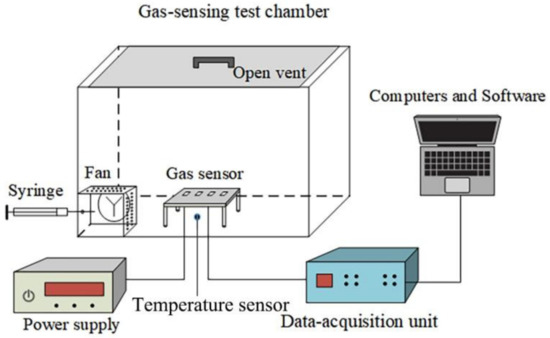 An appropriate amount of terpineol was added to the as-prepared samples and ground separately in a pestle and mortar for 1 h each to obtain 5%, 10%, 15%, pure rGO, and pure MoS2 slurries. Then, for each sample, a small amount of the slurry was coated onto the surface of the flexible interdigital electrode and dried at 80 °C for 1 h. Further, to improve the stability and repeatability of the sensors, they were aged at 60 °C for a week in air. The sensing measurements were carried out on an experimental platform that was developed in our laboratory. The resistance of the MoS2/rGO sensor was measured via the two-wire resistance measurement method. The platform comprised a closed sensor chamber (60 L), low-power circulating fan, data acquisition card, and computer-controlled software system, as shown in Figure 3. The volume of the gas was calculated corresponding to the concentration, and a calibrated gas sampler (e.g., syringe) was used to inject a certain volume of gas into the test chamber. For example, 2 μL corresponded to 10 ppm, and 100 μL corresponded to 500 ppm. Because the volume of the chamber was much larger than that of the injected gas, the gas-sampling error was neglected. The gas was rapidly and evenly distributed by using a fan. When the test gas was adsorbed onto the sensing material, the resistance of the sensing material changed and the electrical signal was measured. Simultaneously, the control software recorded the data by using a data-acquisition unit.