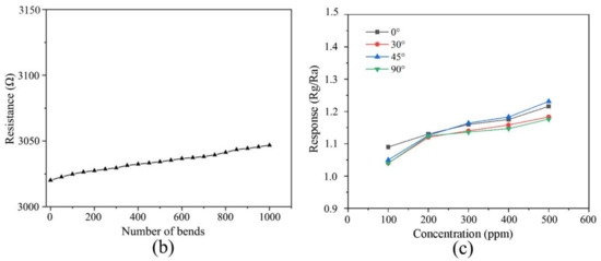To verify the applicability of the rGO/MoS2 flexible gas sensor in wearable and variable electronic equipment, the mechanical properties such as bending and fatigue resistance of the device were evaluated. In this study, the change in device resistance with the number of bends was investigated. A bending experiment was conducted using a bending machine (Bending system, Custom-made setup), as shown in Figure 4a, and the precision of this test was 0.9°. The results of the bending experiment showed that continuous mechanical bending slightly increased the resistance. As shown in Figure 4b, although a small increase in resistance is observed owing to the tensile effect, the resistance of the device is maintained after 1000 bends. Furthermore, the response of the rGO/MoS2 sensor to the change in NH3 gas concentration at different bending angles (0°, 30°, 45°, and 90°) was studied. The deviation owing to the inherent resistance of the substrate was eliminated by calibration. As shown in Figure 4c, the sensor demonstrates excellent gas-sensing performance at bending angles of 0°–90°. The fabricated device exhibited relatively stable conductivity and high bending resistance. The experimental results show that the fabricated rGO/MoS2 sensor possesses mechanical flexibility and can be applicable in complex industrial environments.