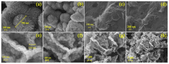 The morphologies of the synthesized samples were studied via SEM; the images are shown in Figure 5. The SEM images of pure MoS2 (Figure 5a,b) show high-density flower-like nanospheres, which is the characteristic morphology of MoS2 [32]. The SEM images of pure rGO (Figure 5c,d) show that the rGO sheet comprises wrinkles and curls, indicating its considerably thin characteristic. The SEM images of the 10% rGO/MoS2 composite material (Figure 5e–h) confirm the good combination between rGO flakes and flower-like MoS2 nanospheres. Curd-like MoS2 in the rGO/MoS2 composite is arranged in a lamellar layer. Compared with that of pure MoS2 (700 nm), the diameter of the curd-like structure (150 nm) is less, as shown in Figure 5a,e. Furthermore, the number of spherical structures is significantly large, which indicates the effective participation of MoS2. Thus, the specific surface area of the material is higher, and the active material can be used more effectively in the electron-transport process.