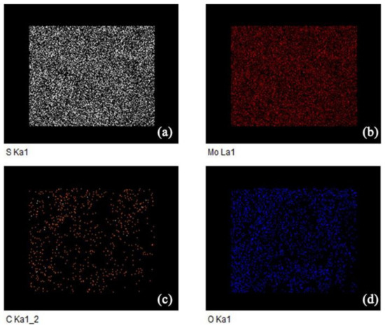Furthermore, we characterized the 10% rGO/MoS2 composite via energy dispersive X-ray spectroscopy (EDXS); the elemental distribution maps are shown in Figure 6. In addition to Mo and S, C was detected. The composite contains a large amount of C and O, indicating the existence and even distribution of rGO in the composite.