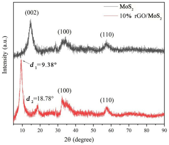 In the XRD patterns of MoS2 and the 10% rGO/MoS2 composite material, no peaks corresponding to other elements are observed (Figure 7), indicating the high purity of the composite material. In the diffraction pattern of MoS2, the main peaks at 14.15°, 33.77°, and 58.49° can be attributed to the (002), (100), and (110) planes of MoS2, respectively (JCPDS card No. 37-1492). We calculated the lattice spacing (d = 6.26 nm) from the (002) peak at 2θ = 14.15° using the Bragg equation, 2dsinθ = nλ (d is the interplanar spacing, half of the diffraction angle (2θ), n = 1, λ = 0.154 nm). In contrast, the rGO/MoS2 composite material exhibits two different peaks at 2θ1 = 9.38° and 2θ2 = 18.78°, and correspond to d1 = 9.42 nm and d2 = 4.82 nm, respectively. The relationship between d1 and d2 indicates that the composite forms a layered structure with a wider interlayer spacing than that of pure MoS2. This may be attributed to the effect of the hydrothermal treatment that caused GO reduction and the disappearance of most of the oxygen-containing functional groups, resulting in the formation of numerous defects in the composite structure. Some of these defect positions combine with MoS2 to form a new interlayer structure [34]. This new type of defect location provides active energy sites for the adsorption of various gas molecules, which is beneficial for the improvement of gas sensitivity.