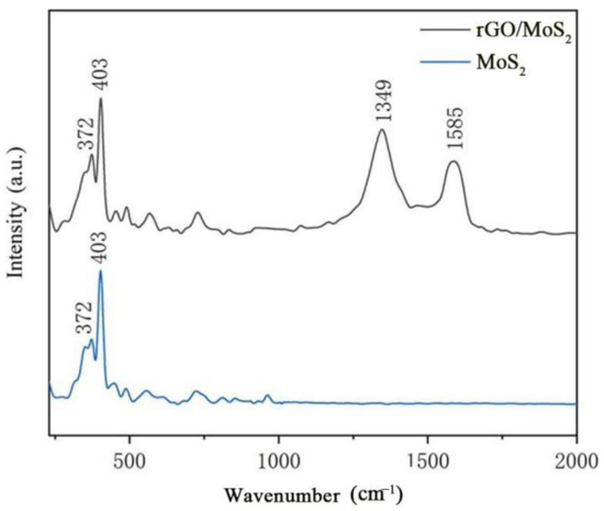 The Raman spectrum of pure MoS2 (Figure 8) features the characteristic peaks of MoS2 at 372 and 403 cm−1, which are E12g and A2g peaks, respectively, thereby confirming that the material is MoS2. The E12g peak is owing to the internal molecular vibration of the sulfur atoms relative to the atomic layer of MoS2, and the vibration of the A2g peak is attributed to the out-of-layer movement of the sulfur atoms in the MoS2 relative to the axis of the non-MoS2 layer. In the 10% rGO/MoS2 composite, the E12g and A2g peaks of MoS2 are evident, and the characteristic peaks ascribed to the D and G bands of rGO are present at 1349 and 1585 cm−1, respectively, which proves that rGO has been successfully added to the mixture. The intensity ratio ID/IG of peaks D and G serves as an important parameter to evaluate the degree of order and defects of carbon materials. Generally, the smaller the ID/IG value, the higher the degree of order of carbon materials [35]. After calculation, the ID/IG value of the 10% rGO/MoS2 composite was approximately 1.39, which was higher than those of rGO (~1.03) and GO (~0.91), indicating that the size of GO decreased after reduction, resulting in the increase in the D peak intensity [36]. In addition, studies have shown that the increase in the ID/IG value indicates the improvement of the electrical properties of GO [37], which is beneficial to improve the gas-sensing response speed of the composite.