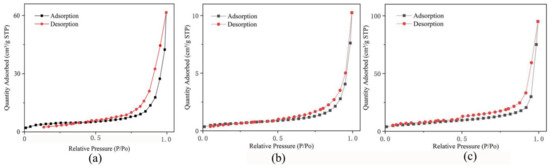 N2 adsorption and desorption isotherms of (a) pure rGO, (b) pure MoS2 and the (c) 10% rGO/MoS2 composite.