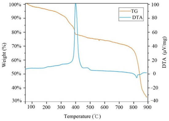 We conducted TGA on the prepared 10% rGO/MoS2 composite; the results are shown in Figure 10. Within the test temperature range of 30–900 °C, the mass loss of the composite occurs in four stages. The small mass loss of 10% rGO/MoS2 in the first stage (30–300 °C) can be attributed to dehydration during physical adsorption. In the second stage (300–400 °C), the mass loss can be attributed to the thermal decomposition of the remaining oxygen-containing functional groups on rGO. In this stage, there is an obvious endothermic peak in the differential thermal analysis (DTA) curve at 400 °C. In the third stage (400–780 °C), the DTA and TG remains in a steady state. In the fourth stage (780–900 °C), the mass loss of the composite is due to the oxidation and pyrolysis of the carbon in rGO. This indicates that the material can maintain stable physical and chemical properties over 30–300 °C, and the heating temperature of the material should not be higher than 300 °C. This result is in line with that reported in another paper [38].