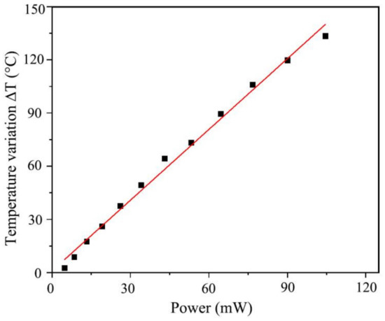 Temperature has an important influence on the response-recovery time and sensitivity of the sensor. To optimize the working conditions of the sensor, the relationship between the heating temperature and the input power of the heating electrode was studied. The sensor temperature (T0) before heating was 22 °C, and the heater used different power levels to obtain the temperature (T). Figure 11 shows the linear relationship between the heating power and the temperature change.