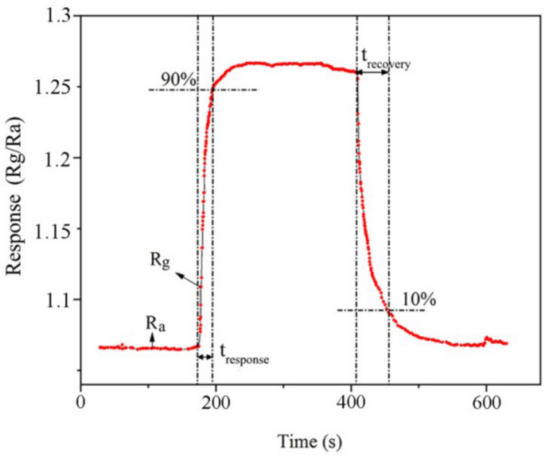 Representative response obtained upon exposing the gas-sensing material to 100 ppm of NH3 gas. Ra represents the basic resistance in air, Rg represents the test resistance value, tresponse represents the response time, and trecovery represents the recovery time.