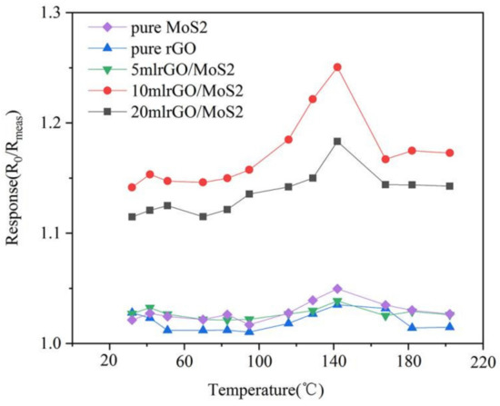 Response of pure MoS2, pure rGO, and rGO/MoS2 composites with different graphene contents to 100 ppm of NH3 at different operating temperatures.