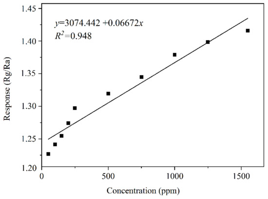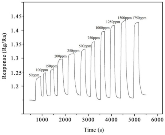 Figure 14 shows the continuous transient resistance–response–recovery curve of the sensor comprising the 10% rGO/MoS2 composite upon exposure to NH3 gas at concentrations of 50–1750 ppm at the optimal operating temperature. It is evident that the resistance of the sensor increases with an increase in the NH3 concentration, indicating its NH3-sensing ability. The change curve (Figure 15) of sensor resistance with the NH3 concentration in an NH3-flushed environment reflects the relationship between the NH3 concentration and the sensor resistance value. The resistance of the sensor comprising the 10% rGO/MoS2 composite exhibits a linear relationship with the NH3 concentration in the range of 50–1500 ppm. The sensitivity of the sensor is 0.06672, and the linearity is relatively high (R2 = 0.948). When the gas concentration was higher than 1500 ppm, the resistance value did not change significantly, indicating that the sensor became saturated at a high concentration of NH3.