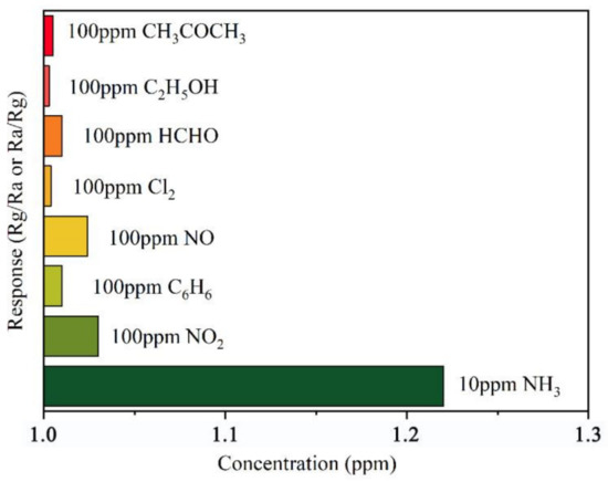 Furthermore, selectivity is an important parameter of the NH3 sensor in practical applications. Figure 16 shows the responses of the 10% rGO/MoS2 sensor to various gases, including Cl2, NO, NO2, and a few typical volatile organic compounds (VOCs). The different responses of the sensor are mainly owing to the inherent chemical properties and reactivities of the gas molecules. It is evident that the response of the sensor to NH3 is much higher than that toward other gases. In addition, the response of the 10% rGO/MoS2 composite to 10 ppm NH3 is much higher than that to 100 ppm VOCs. All these observations confirm the high selectivity of the rGO/MoS2 sensor for NH3 sensing.