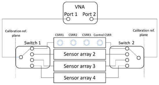 Dielectric characterization of the samples was performed using a Keysight slim form open-ended 200 mm coaxial probe (N1501A) (Keysight, 3110 Rotselaar, Belgium) connected to Keysight PNA (E8361A) (Keysight, 3110 Rotselaar, Belgium). The power level of PNA was set to −5 dBm with 30 Hz IF bandwidth and frequency ranging from 4 GHz to 7 GHz with 100 points in between, resulting in a total sweep time of 3 s. The temperature measurements were performed using the National Instruments USB-TC01 data acquisition device with thermocouple. The CSRRs were designed on a Rogers RO4350b printed circuit board (PCB) with a dielectric constant of 3.66, the thickness of 0.508 mm with 18 μm thick copper cladding, and gold coating of 5.1 μm. Microwell plates were fabricated using polydimethylsiloxane (PDMS) and a 3D printed mold using an in-house available standard 3D printer. The PDMS microplate wells were bonded to the PCB using a thin layer of PDMS. End launch subminiature version A (SMA) coaxial connectors were used to interconnect the CSRR sensor array to a Keysight M9735A vector network analyzer (VNA) and microwave switches. Two analog broadband non-reflective GaAs pHEMT microwave switches, HMC641ALC4 from Analog Devices (Analog Devices, Digi-Key, Enschede, The Netherlands), were used for fast switching between four sensor arrays. The switches do not only increase the reading speed, but they also decrease the equipment cost as only a two-port VNA is sufficient to evaluate multiple transmission lines with cascaded CSRR sensors. The VNA calibration was performed using a Keysight 85052D 3.5 mm calibration kit. The block diagram of a measurement system and calibration reference planes are shown in Figure 2. The first three CSRRs in each sensor array were used for dielectric sensing, while the last one was kept empty through measurements as a control sensor to demonstrate system stability. The measurements were carried out from 4 GHz to 9 GHz, using frequency spacing of 10 MHz (501 points), with the intermediate frequency (IF) bandwidth of 200 Hz and calibration correction turned on. The sweep time for the corresponding settings on used VNA was 2.52 s, which is relatively rapid given that other techniques require a longer measurement time. Furthermore, it is possible to use four distinctive frequency bands and follow the resonant frequency only and thus furthermore reduce the sweep time into the sub-second period. A DC power source E3631A from Agilent Technologies (Keysight, 3110 Rotselaar, Belgium) was used with Arduino Nano microprocessor to bias and automatically control microwave switches.