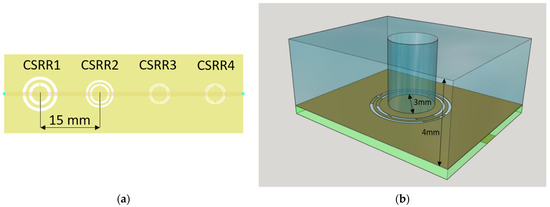 (a) A microstrip line with four CSRRs etched into the ground plane; (b) a PDMS microwell on top of the CSRR.