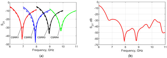 (a) A frequency response of four individual CSRRs etched into the ground plane of a 50 Ω microstrip line, solid line represents MoM simulations and dashed line represents FEM simulations; (b) a measured frequency response of four CSRRs in cascade.